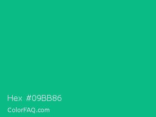 Hex #09bb86 Color is a normal green color and the nearest color is Mountain Meadow Crayola #1ab385. Hex code #09bb86 and RGB value is rgb(9,187,134). In RGB color space, this color is composed of 4% red, 73% green, 53% blue, In CMYK color space, this color is composed of 95% cyan, 0% magenta, 28% yellow , 27% black , In HSL color space, this color has a hue angle of 162° , 91% saturation and 38% lightness.