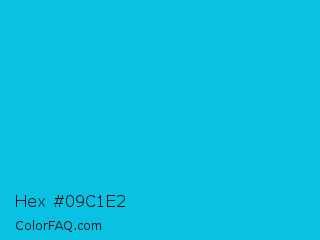 Hex #09c1e2 Color is a normal cyan color and the nearest color is Cyan Process #00b7eb. Hex code #09c1e2 and RGB value is rgb(9,193,226). In RGB color space, this color is composed of 4% red, 76% green, 89% blue, In CMYK color space, this color is composed of 96% cyan, 15% magenta, 0% yellow , 11% black , In HSL color space, this color has a hue angle of 189° , 92% saturation and 46% lightness.