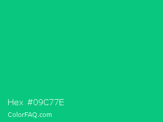 Hex #09c77e Color is a normal green color and the nearest color is Mountain Meadow Crayola #1ab385. Hex code #09c77e and RGB value is rgb(9,199,126). In RGB color space, this color is composed of 4% red, 78% green, 49% blue, In CMYK color space, this color is composed of 95% cyan, 0% magenta, 37% yellow , 22% black , In HSL color space, this color has a hue angle of 157° , 91% saturation and 41% lightness.