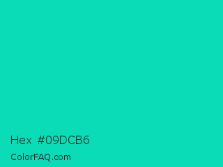 Hex #09dcb6 Color is a normal cyan color and the nearest color is Amazonite #00c4b0. Hex code #09dcb6 and RGB value is rgb(9,220,182). In RGB color space, this color is composed of 4% red, 86% green, 71% blue, In CMYK color space, this color is composed of 96% cyan, 0% magenta, 17% yellow , 14% black , In HSL color space, this color has a hue angle of 169° , 92% saturation and 45% lightness.