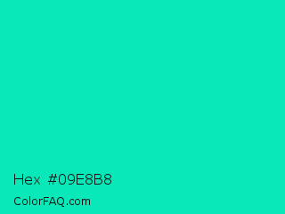 Hex #09e8b8 Color is a normal cyan color and the nearest color is Robins Egg Blue #00cccc. Hex code #09e8b8 and RGB value is rgb(9,232,184). In RGB color space, this color is composed of 4% red, 91% green, 72% blue, In CMYK color space, this color is composed of 96% cyan, 0% magenta, 21% yellow , 9% black , In HSL color space, this color has a hue angle of 167° , 93% saturation and 47% lightness.