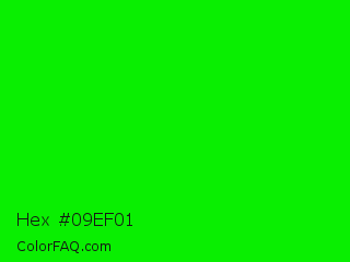 Hex #09ef01 Color is a normal green color and the nearest color is Green #00ff00. Hex code #09ef01 and RGB value is rgb(9,239,1). In RGB color space, this color is composed of 4% red, 94% green, 0% blue, In CMYK color space, this color is composed of 96% cyan, 0% magenta, 100% yellow , 6% black , In HSL color space, this color has a hue angle of 118° , 99% saturation and 47% lightness.