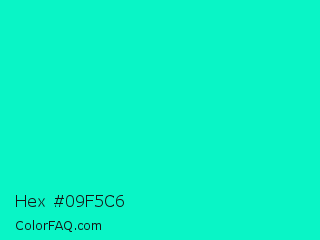 Hex #09f5c6 Color is a normal cyan color and the nearest color is Bright Turquoise #08e8de. Hex code #09f5c6 and RGB value is rgb(9,245,198). In RGB color space, this color is composed of 4% red, 96% green, 78% blue, In CMYK color space, this color is composed of 96% cyan, 0% magenta, 19% yellow , 4% black , In HSL color space, this color has a hue angle of 168° , 93% saturation and 50% lightness.