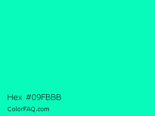 Hex #09fbbb Color is a normal cyan color and the nearest color is Medium Spring Green #00fa9a. Hex code #09fbbb and RGB value is rgb(9,251,187). In RGB color space, this color is composed of 4% red, 98% green, 73% blue, In CMYK color space, this color is composed of 96% cyan, 0% magenta, 25% yellow , 2% black , In HSL color space, this color has a hue angle of 164° , 97% saturation and 51% lightness.