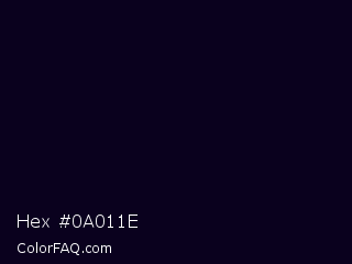 Hex #0a011e Color is a almost black indigo color and the nearest color is Black Russian #0a001c. Hex code #0a011e and RGB value is rgb(10,1,30). In RGB color space, this color is composed of 4% red, 0% green, 12% blue, In CMYK color space, this color is composed of 67% cyan, 97% magenta, 0% yellow , 88% black , In HSL color space, this color has a hue angle of 259° , 94% saturation and 6% lightness.