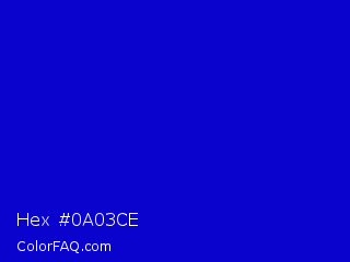 Hex #0a03ce Color is a normal indigo color and the nearest color is Medium Blue #0000cd. Hex code #0a03ce and RGB value is rgb(10,3,206). In RGB color space, this color is composed of 4% red, 1% green, 81% blue, In CMYK color space, this color is composed of 95% cyan, 99% magenta, 0% yellow , 19% black , In HSL color space, this color has a hue angle of 242° , 97% saturation and 41% lightness.