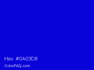 Hex #0a03d8 Color is a normal indigo color and the nearest color is Medium Blue #0000cd. Hex code #0a03d8 and RGB value is rgb(10,3,216). In RGB color space, this color is composed of 4% red, 1% green, 85% blue, In CMYK color space, this color is composed of 95% cyan, 99% magenta, 0% yellow , 15% black , In HSL color space, this color has a hue angle of 242° , 97% saturation and 43% lightness.