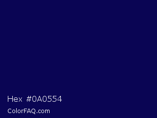 Hex #0a0554 Color is a very dark indigo color and the nearest color is Gulf Blue #051657. Hex code #0a0554 and RGB value is rgb(10,5,84). In RGB color space, this color is composed of 4% red, 2% green, 33% blue, In CMYK color space, this color is composed of 88% cyan, 94% magenta, 0% yellow , 67% black , In HSL color space, this color has a hue angle of 244° , 89% saturation and 17% lightness.
