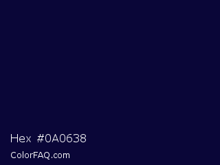 Hex #0a0638 Color is a very dark indigo color and the nearest color is Black Rock #0d0332. Hex code #0a0638 and RGB value is rgb(10,6,56). In RGB color space, this color is composed of 4% red, 2% green, 22% blue, In CMYK color space, this color is composed of 82% cyan, 89% magenta, 0% yellow , 78% black , In HSL color space, this color has a hue angle of 245° , 81% saturation and 12% lightness.