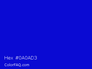 Hex #0a0ad3 Color is a normal blue color and the nearest color is Medium Blue #0000cd. Hex code #0a0ad3 and RGB value is rgb(10,10,211). In RGB color space, this color is composed of 4% red, 4% green, 83% blue, In CMYK color space, this color is composed of 95% cyan, 95% magenta, 0% yellow , 17% black , In HSL color space, this color has a hue angle of 240° , 91% saturation and 43% lightness.