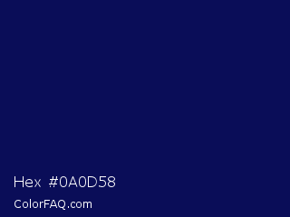 Hex #0a0d58 Color is a very dark blue color and the nearest color is Gulf Blue #051657. Hex code #0a0d58 and RGB value is rgb(10,13,88). In RGB color space, this color is composed of 4% red, 5% green, 35% blue, In CMYK color space, this color is composed of 89% cyan, 85% magenta, 0% yellow , 65% black , In HSL color space, this color has a hue angle of 238° , 80% saturation and 19% lightness.
