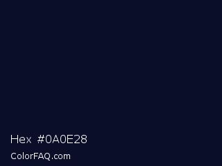 Hex #0a0e28 Color is a very dark blue color and the nearest color is Black Pearl #041322. Hex code #0a0e28 and RGB value is rgb(10,14,40). In RGB color space, this color is composed of 4% red, 5% green, 16% blue, In CMYK color space, this color is composed of 75% cyan, 65% magenta, 0% yellow , 84% black , In HSL color space, this color has a hue angle of 232° , 60% saturation and 10% lightness.