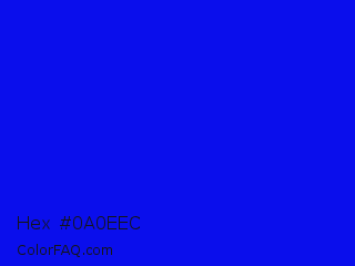 Hex #0a0eec Color is a normal blue color and the nearest color is Bluebonnet #1c1cf0. Hex code #0a0eec and RGB value is rgb(10,14,236). In RGB color space, this color is composed of 4% red, 5% green, 93% blue, In CMYK color space, this color is composed of 96% cyan, 94% magenta, 0% yellow , 7% black , In HSL color space, this color has a hue angle of 239° , 92% saturation and 48% lightness.