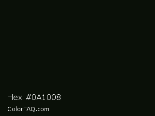 Hex #0a1008 Color is a almost black green color and the nearest color is Marshland #0b0f08. Hex code #0a1008 and RGB value is rgb(10,16,8). In RGB color space, this color is composed of 4% red, 6% green, 3% blue, In CMYK color space, this color is composed of 38% cyan, 0% magenta, 50% yellow , 94% black , In HSL color space, this color has a hue angle of 105° , 33% saturation and 5% lightness.