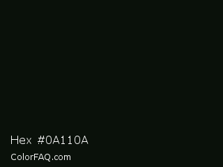 Hex #0a110a Color is a almost black green color and the nearest color is Marshland #0b0f08. Hex code #0a110a and RGB value is rgb(10,17,10). In RGB color space, this color is composed of 4% red, 7% green, 4% blue, In CMYK color space, this color is composed of 41% cyan, 0% magenta, 41% yellow , 93% black , In HSL color space, this color has a hue angle of 120° , 26% saturation and 5% lightness.