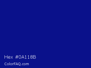 Hex #0a118b Color is a dark blue color and the nearest color is Phthalo Blue #000f89. Hex code #0a118b and RGB value is rgb(10,17,139). In RGB color space, this color is composed of 4% red, 7% green, 55% blue, In CMYK color space, this color is composed of 93% cyan, 88% magenta, 0% yellow , 45% black , In HSL color space, this color has a hue angle of 237° , 87% saturation and 29% lightness.