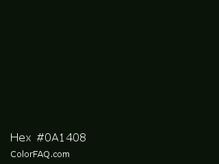 Hex #0a1408 Color is a almost black green color and the nearest color is Gordons Green #0b1107. Hex code #0a1408 and RGB value is rgb(10,20,8). In RGB color space, this color is composed of 4% red, 8% green, 3% blue, In CMYK color space, this color is composed of 50% cyan, 0% magenta, 60% yellow , 92% black , In HSL color space, this color has a hue angle of 110° , 43% saturation and 5% lightness.