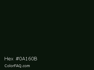 Hex #0a160b Color is a almost black green color and the nearest color is Black Bean #081910. Hex code #0a160b and RGB value is rgb(10,22,11). In RGB color space, this color is composed of 4% red, 9% green, 4% blue, In CMYK color space, this color is composed of 55% cyan, 0% magenta, 50% yellow , 91% black , In HSL color space, this color has a hue angle of 125° , 38% saturation and 6% lightness.