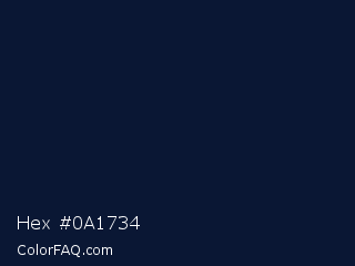Hex #0a1734 Color is a very dark blue color and the nearest color is Midnight #011635. Hex code #0a1734 and RGB value is rgb(10,23,52). In RGB color space, this color is composed of 4% red, 9% green, 20% blue, In CMYK color space, this color is composed of 81% cyan, 56% magenta, 0% yellow , 80% black , In HSL color space, this color has a hue angle of 221° , 68% saturation and 12% lightness.