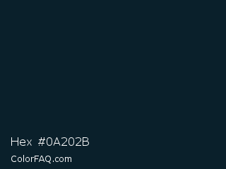 Hex #0a202b Color is a very dark blue color and the nearest color is Firefly #0e2a30. Hex code #0a202b and RGB value is rgb(10,32,43). In RGB color space, this color is composed of 4% red, 13% green, 17% blue, In CMYK color space, this color is composed of 77% cyan, 26% magenta, 0% yellow , 83% black , In HSL color space, this color has a hue angle of 200° , 62% saturation and 10% lightness.