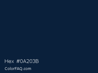 Hex #0a203b Color is a very dark blue color and the nearest color is Maastricht Blue #001c3d. Hex code #0a203b and RGB value is rgb(10,32,59). In RGB color space, this color is composed of 4% red, 13% green, 23% blue, In CMYK color space, this color is composed of 83% cyan, 46% magenta, 0% yellow , 77% black , In HSL color space, this color has a hue angle of 213° , 71% saturation and 14% lightness.
