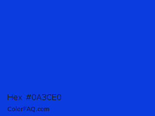 Hex #0a3ce0 Color is a normal blue color and the nearest color is Palatinate Blue #273be2. Hex code #0a3ce0 and RGB value is rgb(10,60,224). In RGB color space, this color is composed of 4% red, 24% green, 88% blue, In CMYK color space, this color is composed of 96% cyan, 73% magenta, 0% yellow , 12% black , In HSL color space, this color has a hue angle of 226° , 91% saturation and 46% lightness.