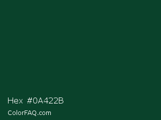 Hex #0a422b Color is a very dark green color and the nearest color is Sherwood Green #02402c. Hex code #0a422b and RGB value is rgb(10,66,43). In RGB color space, this color is composed of 4% red, 26% green, 17% blue, In CMYK color space, this color is composed of 85% cyan, 0% magenta, 35% yellow , 74% black , In HSL color space, this color has a hue angle of 155° , 74% saturation and 15% lightness.