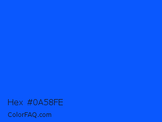 Hex #0a58fe Color is a normal blue color and the nearest color is Blue Ribbon #0066ff. Hex code #0a58fe and RGB value is rgb(10,88,254). In RGB color space, this color is composed of 4% red, 35% green, 100% blue, In CMYK color space, this color is composed of 96% cyan, 65% magenta, 0% yellow , 0% black , In HSL color space, this color has a hue angle of 221° , 99% saturation and 52% lightness.