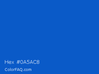 Hex #0a5ac8 Color is a normal blue color and the nearest color is Science Blue #0066cc. Hex code #0a5ac8 and RGB value is rgb(10,90,200). In RGB color space, this color is composed of 4% red, 35% green, 78% blue, In CMYK color space, this color is composed of 95% cyan, 55% magenta, 0% yellow , 22% black , In HSL color space, this color has a hue angle of 215° , 90% saturation and 41% lightness.