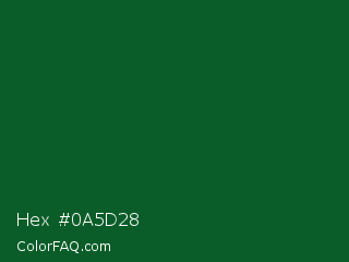 Hex #0a5d28 Color is a very dark green color and the nearest color is Camarone #00581a. Hex code #0a5d28 and RGB value is rgb(10,93,40). In RGB color space, this color is composed of 4% red, 36% green, 16% blue, In CMYK color space, this color is composed of 89% cyan, 0% magenta, 57% yellow , 64% black , In HSL color space, this color has a hue angle of 142° , 81% saturation and 20% lightness.