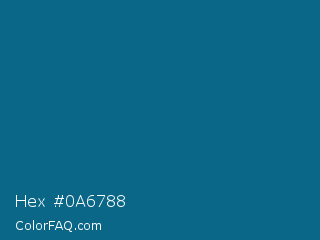 Hex #0a6788 Color is a dark blue color and the nearest color is Blue Sapphire #126180. Hex code #0a6788 and RGB value is rgb(10,103,136). In RGB color space, this color is composed of 4% red, 40% green, 53% blue, In CMYK color space, this color is composed of 93% cyan, 24% magenta, 0% yellow , 47% black , In HSL color space, this color has a hue angle of 196° , 86% saturation and 29% lightness.
