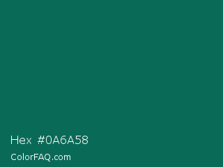 Hex #0a6a58 Color is a dark cyan color and the nearest color is Watercourse #056f57. Hex code #0a6a58 and RGB value is rgb(10,106,88). In RGB color space, this color is composed of 4% red, 42% green, 35% blue, In CMYK color space, this color is composed of 91% cyan, 0% magenta, 17% yellow , 58% black , In HSL color space, this color has a hue angle of 169° , 83% saturation and 23% lightness.