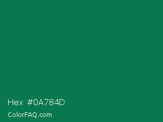 Hex #0a784d Color is a dark green color and the nearest color is Salem #097f4b. Hex code #0a784d and RGB value is rgb(10,120,77). In RGB color space, this color is composed of 4% red, 47% green, 30% blue, In CMYK color space, this color is composed of 92% cyan, 0% magenta, 36% yellow , 53% black , In HSL color space, this color has a hue angle of 157° , 85% saturation and 25% lightness.
