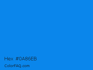 Hex #0a86eb Color is a normal blue color and the nearest color is Azure Radiance #007fff. Hex code #0a86eb and RGB value is rgb(10,134,235). In RGB color space, this color is composed of 4% red, 53% green, 92% blue, In CMYK color space, this color is composed of 96% cyan, 43% magenta, 0% yellow , 8% black , In HSL color space, this color has a hue angle of 207° , 92% saturation and 48% lightness.