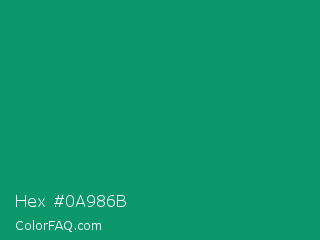 Hex #0a986b Color is a normal green color and the nearest color is Green Cyan #009966. Hex code #0a986b and RGB value is rgb(10,152,107). In RGB color space, this color is composed of 4% red, 60% green, 42% blue, In CMYK color space, this color is composed of 93% cyan, 0% magenta, 30% yellow , 40% black , In HSL color space, this color has a hue angle of 161° , 88% saturation and 32% lightness.