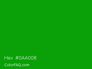 Hex #0aa008 Color is a normal green color and the nearest color is Islamic Green #009000. Hex code #0aa008 and RGB value is rgb(10,160,8). In RGB color space, this color is composed of 4% red, 63% green, 3% blue, In CMYK color space, this color is composed of 94% cyan, 0% magenta, 95% yellow , 37% black , In HSL color space, this color has a hue angle of 119° , 90% saturation and 33% lightness.