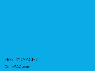 Hex #0aace7 Color is a normal blue color and the nearest color is Vivid Cerulean #00aaee. Hex code #0aace7 and RGB value is rgb(10,172,231). In RGB color space, this color is composed of 4% red, 67% green, 91% blue, In CMYK color space, this color is composed of 96% cyan, 26% magenta, 0% yellow , 9% black , In HSL color space, this color has a hue angle of 196° , 92% saturation and 47% lightness.