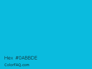 Hex #0abbde Color is a normal cyan color and the nearest color is Cyan Process #00b7eb. Hex code #0abbde and RGB value is rgb(10,187,222). In RGB color space, this color is composed of 4% red, 73% green, 87% blue, In CMYK color space, this color is composed of 95% cyan, 16% magenta, 0% yellow , 13% black , In HSL color space, this color has a hue angle of 190° , 91% saturation and 45% lightness.