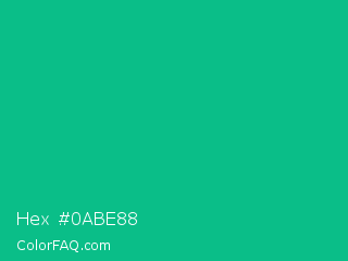Hex #0abe88 Color is a normal green color and the nearest color is Mountain Meadow Crayola #1ab385. Hex code #0abe88 and RGB value is rgb(10,190,136). In RGB color space, this color is composed of 4% red, 75% green, 53% blue, In CMYK color space, this color is composed of 95% cyan, 0% magenta, 28% yellow , 25% black , In HSL color space, this color has a hue angle of 162° , 90% saturation and 39% lightness.