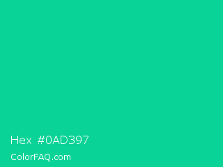 Hex #0ad397 Color is a normal green color and the nearest color is Caribbean Green #00cc99. Hex code #0ad397 and RGB value is rgb(10,211,151). In RGB color space, this color is composed of 4% red, 83% green, 59% blue, In CMYK color space, this color is composed of 95% cyan, 0% magenta, 28% yellow , 17% black , In HSL color space, this color has a hue angle of 162° , 91% saturation and 43% lightness.