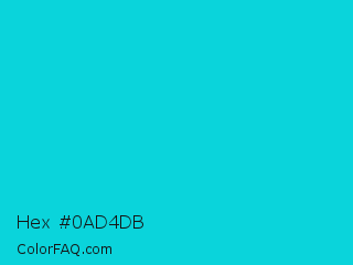 Hex #0ad4db Color is a normal cyan color and the nearest color is Dark Turquoise #00ced1. Hex code #0ad4db and RGB value is rgb(10,212,219). In RGB color space, this color is composed of 4% red, 83% green, 86% blue, In CMYK color space, this color is composed of 95% cyan, 3% magenta, 0% yellow , 14% black , In HSL color space, this color has a hue angle of 182° , 91% saturation and 45% lightness.