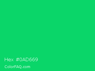 Hex #0ad669 Color is a normal green color and the nearest color is Malachite #0bda51. Hex code #0ad669 and RGB value is rgb(10,214,105). In RGB color space, this color is composed of 4% red, 84% green, 41% blue, In CMYK color space, this color is composed of 95% cyan, 0% magenta, 51% yellow , 16% black , In HSL color space, this color has a hue angle of 148° , 91% saturation and 44% lightness.