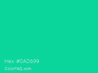 Hex #0ad699 Color is a normal green color and the nearest color is Caribbean Green #00cc99. Hex code #0ad699 and RGB value is rgb(10,214,153). In RGB color space, this color is composed of 4% red, 84% green, 60% blue, In CMYK color space, this color is composed of 95% cyan, 0% magenta, 29% yellow , 16% black , In HSL color space, this color has a hue angle of 162° , 91% saturation and 44% lightness.