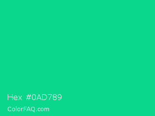 Hex #0ad789 Color is a normal green color and the nearest color is Caribbean Green #00cc99. Hex code #0ad789 and RGB value is rgb(10,215,137). In RGB color space, this color is composed of 4% red, 84% green, 54% blue, In CMYK color space, this color is composed of 95% cyan, 0% magenta, 36% yellow , 16% black , In HSL color space, this color has a hue angle of 157° , 91% saturation and 44% lightness.
