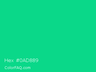 Hex #0ad889 Color is a normal green color and the nearest color is Caribbean Green #00cc99. Hex code #0ad889 and RGB value is rgb(10,216,137). In RGB color space, this color is composed of 4% red, 85% green, 54% blue, In CMYK color space, this color is composed of 95% cyan, 0% magenta, 37% yellow , 15% black , In HSL color space, this color has a hue angle of 157° , 91% saturation and 44% lightness.