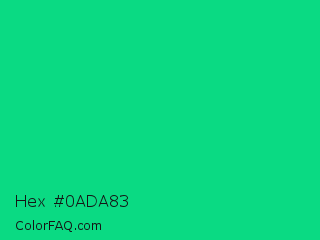 Hex #0ada83 Color is a normal green color and the nearest color is Caribbean Green #00cc99. Hex code #0ada83 and RGB value is rgb(10,218,131). In RGB color space, this color is composed of 4% red, 85% green, 51% blue, In CMYK color space, this color is composed of 95% cyan, 0% magenta, 40% yellow , 15% black , In HSL color space, this color has a hue angle of 155° , 91% saturation and 45% lightness.