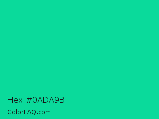 Hex #0ada9b Color is a normal green color and the nearest color is Caribbean Green #00cc99. Hex code #0ada9b and RGB value is rgb(10,218,155). In RGB color space, this color is composed of 4% red, 85% green, 61% blue, In CMYK color space, this color is composed of 95% cyan, 0% magenta, 29% yellow , 15% black , In HSL color space, this color has a hue angle of 162° , 91% saturation and 45% lightness.