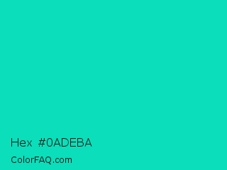 Hex #0adeba Color is a normal cyan color and the nearest color is Robins Egg Blue #00cccc. Hex code #0adeba and RGB value is rgb(10,222,186). In RGB color space, this color is composed of 4% red, 87% green, 73% blue, In CMYK color space, this color is composed of 95% cyan, 0% magenta, 16% yellow , 13% black , In HSL color space, this color has a hue angle of 170° , 91% saturation and 45% lightness.