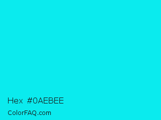 Hex #0aebee Color is a normal cyan color and the nearest color is Bright Turquoise #08e8de. Hex code #0aebee and RGB value is rgb(10,235,238). In RGB color space, this color is composed of 4% red, 92% green, 93% blue, In CMYK color space, this color is composed of 96% cyan, 1% magenta, 0% yellow , 7% black , In HSL color space, this color has a hue angle of 181° , 92% saturation and 49% lightness.