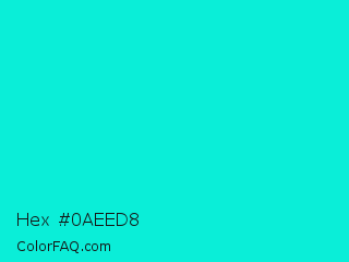 Hex #0aeed8 Color is a normal cyan color and the nearest color is Bright Turquoise #08e8de. Hex code #0aeed8 and RGB value is rgb(10,238,216). In RGB color space, this color is composed of 4% red, 93% green, 85% blue, In CMYK color space, this color is composed of 96% cyan, 0% magenta, 9% yellow , 7% black , In HSL color space, this color has a hue angle of 174° , 92% saturation and 49% lightness.